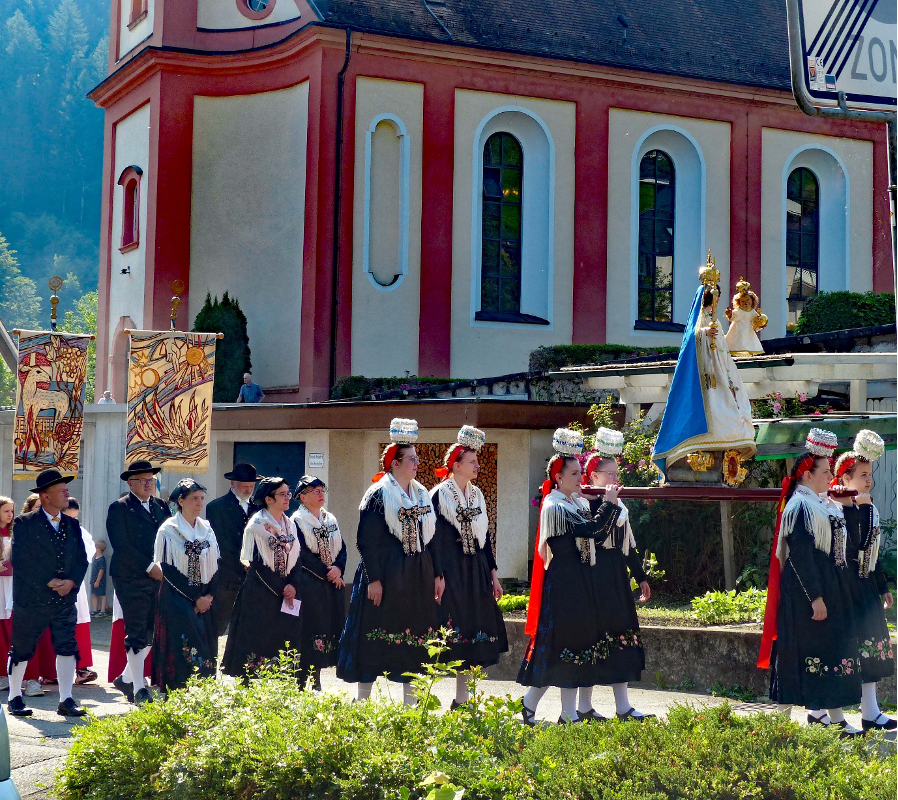 Angeführt von der Trachtenkapelle und den Ministranten folgten die Schäppelmaidle der Trachtengruppe und trugen die Mutter-Gottes-Statue auf deren Schultern, während die Himmelträger Diakon Willi Bröhl den nötigen Schatten spendeten.