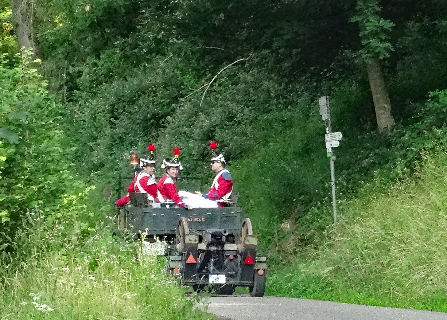 Verdienter Lohn für die Schützen war eine Einladung der Pfarrgemeinde. Im rustikalen Gespann aus Unimog und Kanone ging es dann zusammen mit der Trachtengruppe zum traditionellen Frühschoppen und anschließendem Mittagessen in die Gartenwirtschaft des nahegelegenen „3-König“.